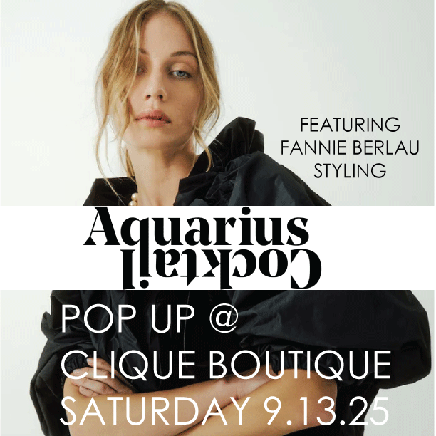 Shop new Fall styles from Aquarius Cocktail Saturday September 13th! Fannie Berlau Styling will be there to help you find your favorite pieces!