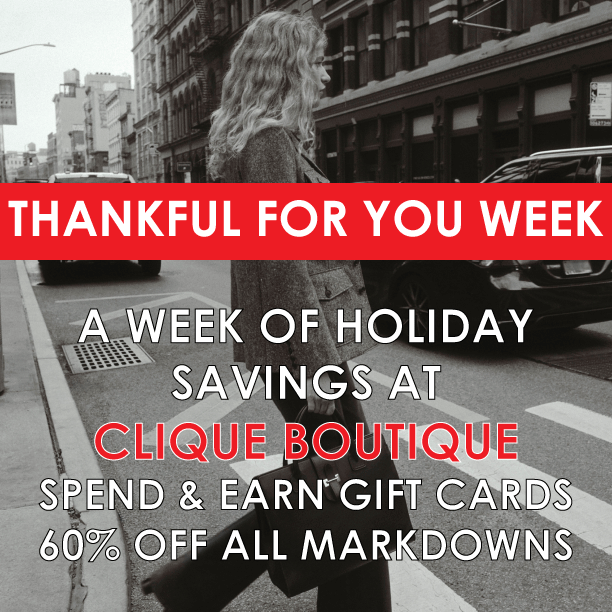 SHOP THE WEEK OF NOVEMBER 24TH-29TH TO EARN A CLIQUE GIFT CARD TO USE DECEMBER 1ST-24TH! ALSO ENJOY 60% OFF PREVIOUSLY MARKED DOWN ITEMS!